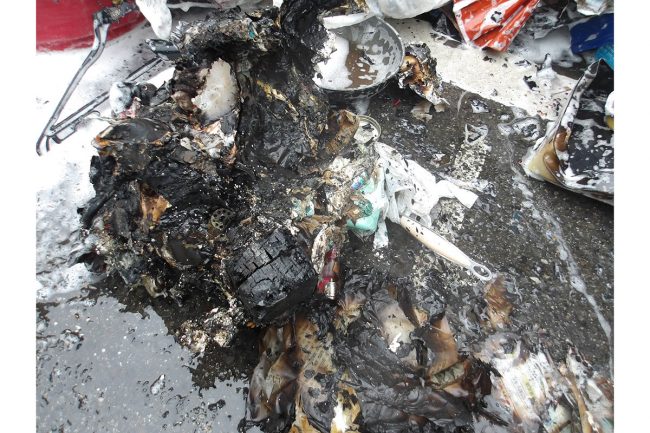 リチウムイオン電池はその構造から、バッテリーに強い衝撃が加わると発火することがあります。いちど発火すると、小さな爆発を伴いながら、燃え尽きるまで火は収まらない状態になり、大火災に発展します。