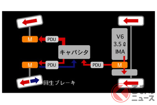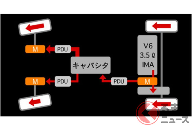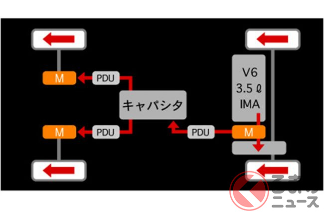 このシステムにより、前輪はモーターで駆動し、後輪はエンジンとモーターで駆動する構成となり、当時としては先進的なトルク配分制御を実現していました。