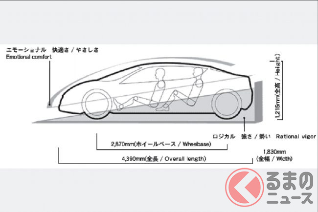 ホンダはこの造形について、フロントノーズからリアウインドウにかけてを「エモーショナル(快適/優しさ)」、フロントタイヤ下部からリアウインドウ下端までを「ロジカル(強さ/勢い)」と位置づけ、相反する要素を上下で表現したと説明しています。
