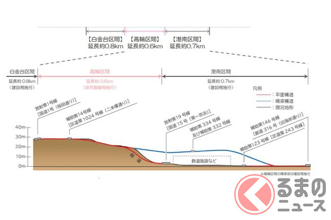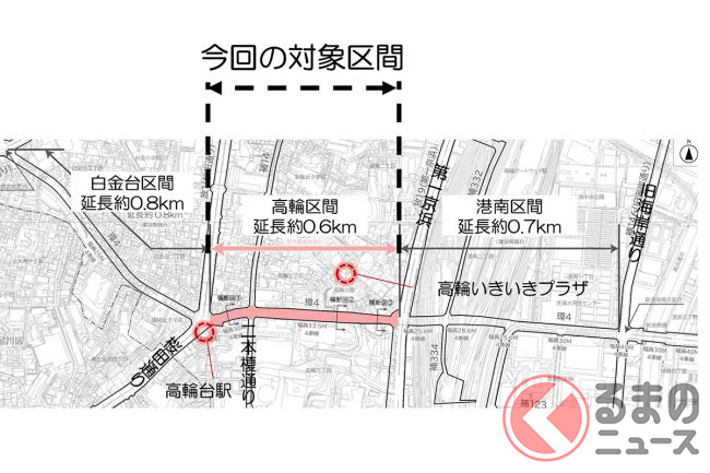 整備計画の中で「高輪区間」と呼ばれるのは、港区高輪三丁目地内を通る桜田通り(国道1号)から第一京浜(国道15号)までの延長約610mの範囲です。
