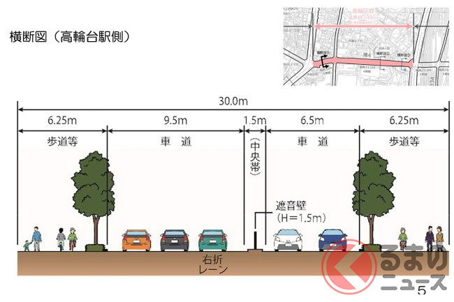 また、高輪台駅側の平面部では、車道幅員が片側6.5mから9.5mとなり、右折レーンの設置や、高さ1.5mの遮音壁の整備なども盛り込まれており、周辺環境への配慮が伺えます。