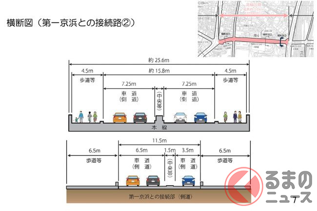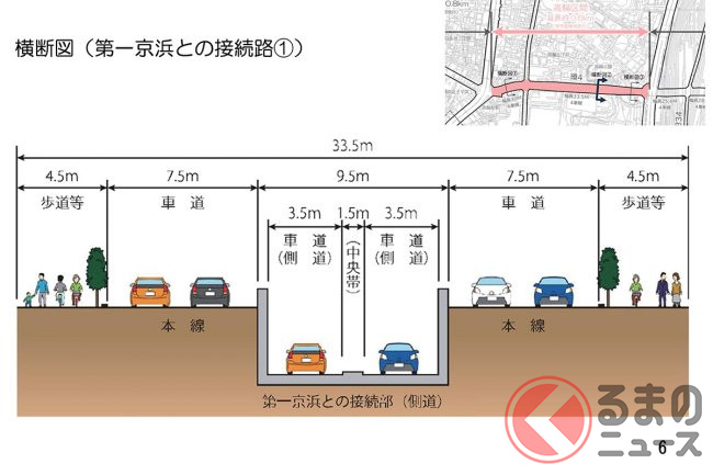 交差点部分や各区間の横断図を確認すると、第一京浜との接続路(側道)部分では、中央の本線が地下方向へ潜るような立体構造となり、その両脇に片側3.5mの側道が確保されます。