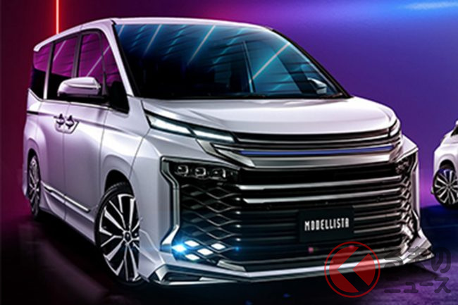 トヨタ新型「ヴォクシー」の“タフモデル”に注目! 「横一文字LED」&「大型メッキ」の重厚エアロが精悍! 刷新された「ブラックグリル」と融合するモデリスタ仕様とは
