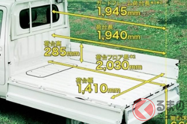 ピクシストラックのボディサイズは全長3395mm×全幅1475mm×全高1780mm、ホイールベース1900mmと、軽自動車規格いっぱいに設計されており、フロア長が2030mmというクラス最大級の広大な荷台を備えています。