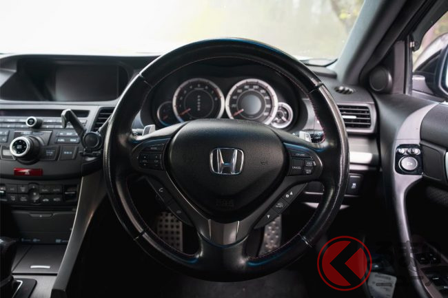 エンジンは2.4リッター直列4気筒DOHC「K24A」と5速ATの組み合わせです。最近のクルマと違ってアクセル操作に対してスロットル早開きなのは当時のホンダ車あるあるですが、実用域は新車と同じくトルクフルかつ元気で軽快な印象ですが、当時の「7000rpmまでストレスなくスッキリ回る」と言う滑らかさは無く、ちょっと苦しそうに回っている感じ。