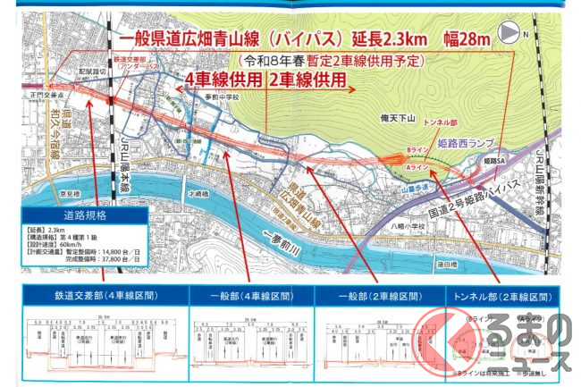 兵庫県が2001年度から着々と整備を進めてきた道路改築事業「県道広畑青山線バイパス」が、いよいよ2026年4月26日16時に暫定2車線で開通します。