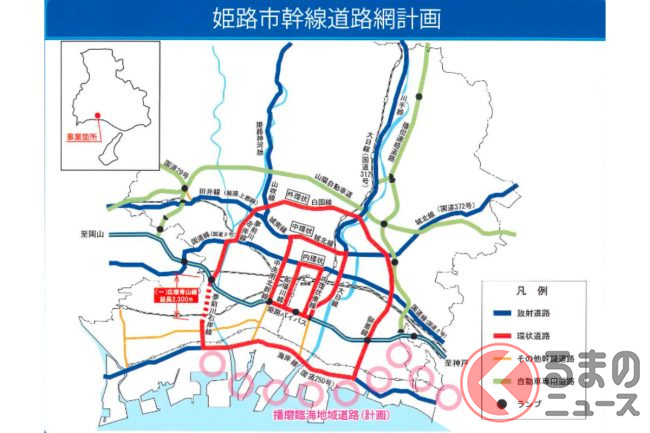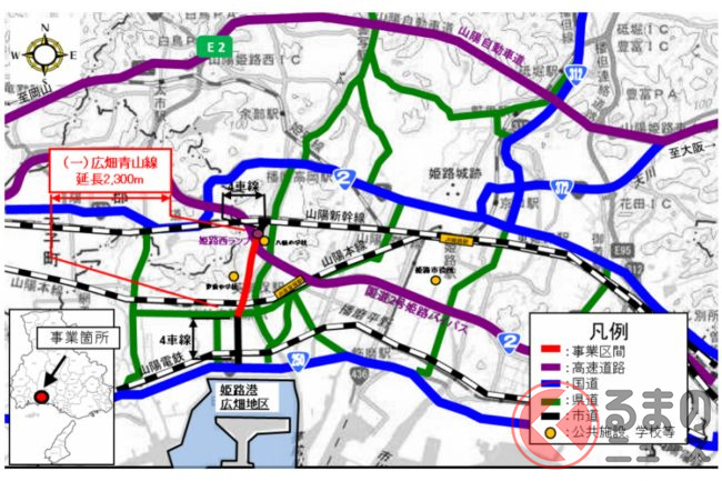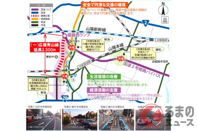 今回供用が開始されるのは、姫路市広畑区才から西蒲田に至る延長2.3kmの区間で、国道2号姫路バイパスの姫路西ランプと、県道和久今宿線の正門一丁目交差点が一本の道で結ばれることになります。