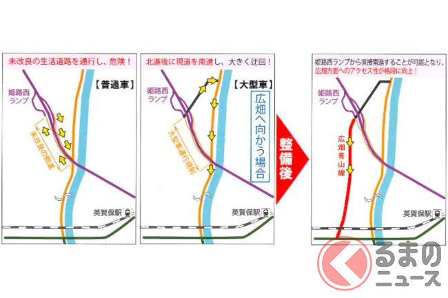 これまでは、広畑方面から姫路西ランプへ向かう際、道幅の狭い生活道路を通り抜けるか、大きく迂回して混雑の激しい現道を走行する必要がありました。