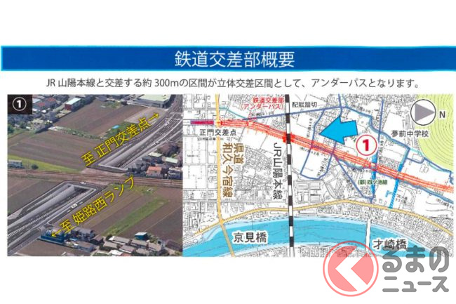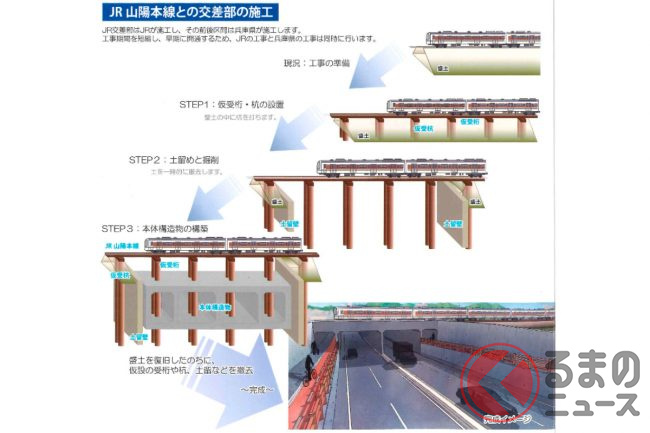 バイパスの全線開通を支えるのは、2つの巨大な構造物です。一つはJR山陽本線と交差するアンダーパス部で、約300mの区間を立体交差化することで踏切待ちによる渋滞を完全に排除しました。この工事はJR西日本と兵庫県が密に連携し、鉄道の安全運行を維持しながら慎重に進められました。