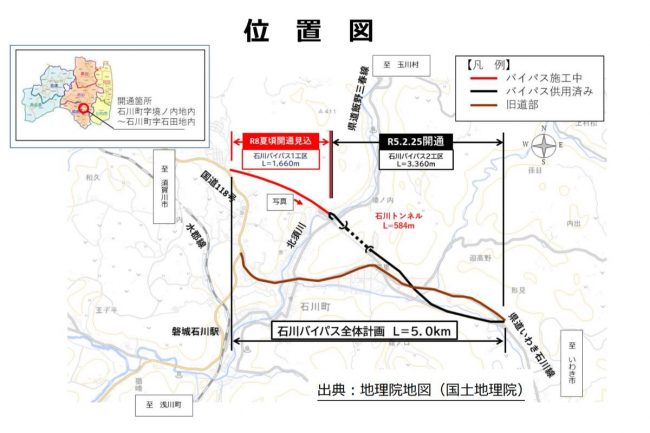 今夏の全線開通が発表された「石川バイパス」は、石川町大字形見から石川町字石田にかけて設けられた、延長約5kmのバイパス区間です。JR水郡線の磐城石川駅付近にあります。