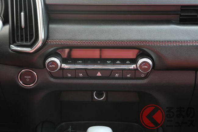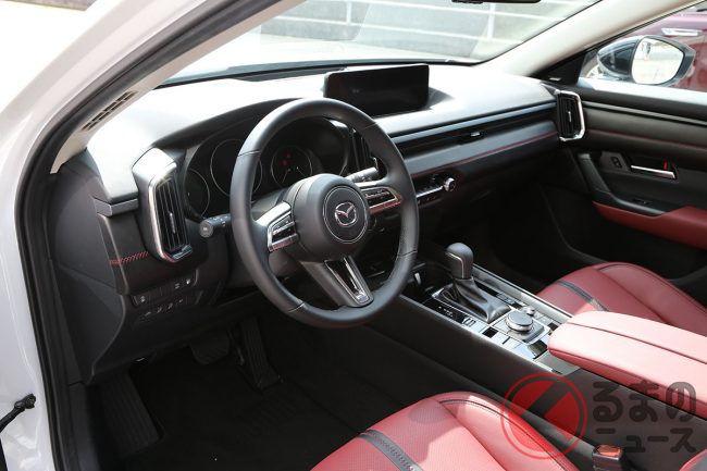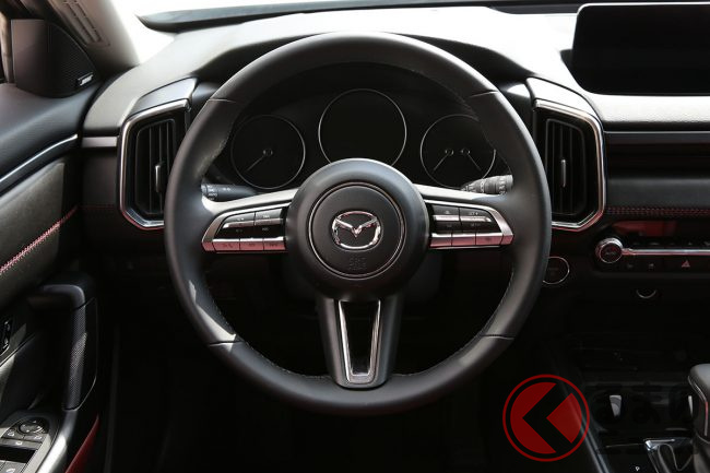 CX-60や「CX-80」などのラージ商品群が流麗なスタイルである一方、CX-50では水平基調のホイールアーチや、控えめなメッキ加飾などが、よりアウトドアらしい雰囲気です。