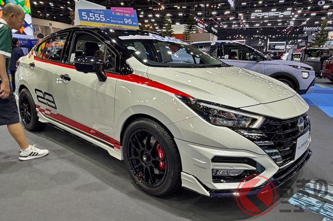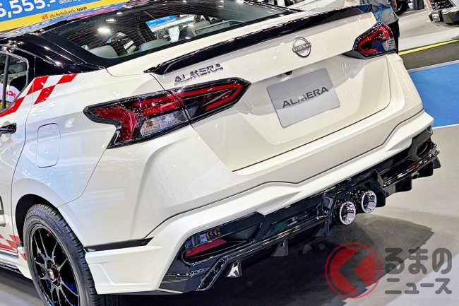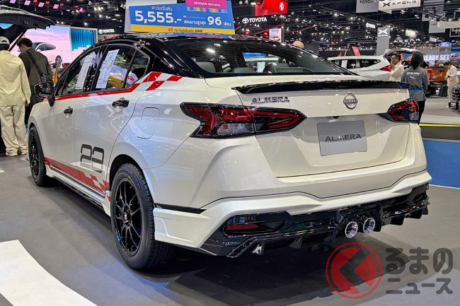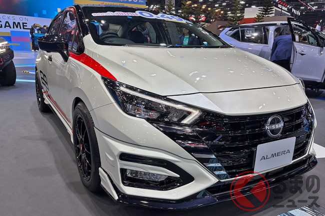 日産「アルメーラ」は、東南アジア市場で展開されているコンパクトセダンです。1リッターターボの実用モデルですが、「バンコクモーターショー2026」では、エアロパーツなどで大胆にカスタマイズされたモデルが出展され注目を集めていました。