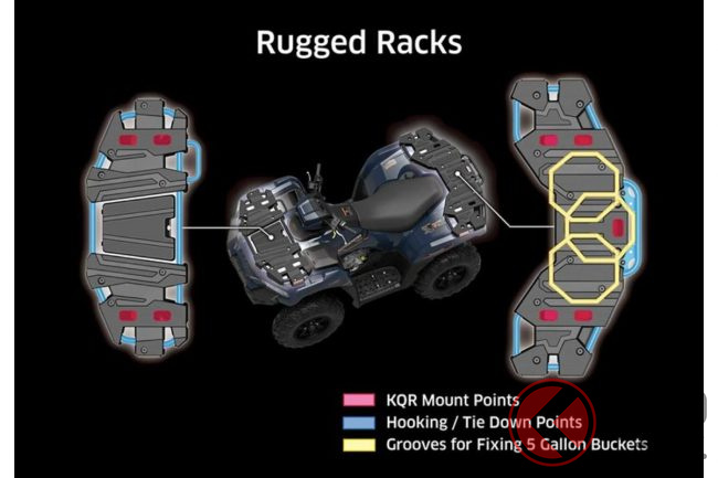 車体の前後には樹脂製カバー付きの堅牢なカーゴラックが備えられており、カワサキ独自のクイックリリース機構(KQR)や、バケツを固定するための専用溝まで用意されるなど、プロの現場で求められる機能性を徹底的に追求しました。