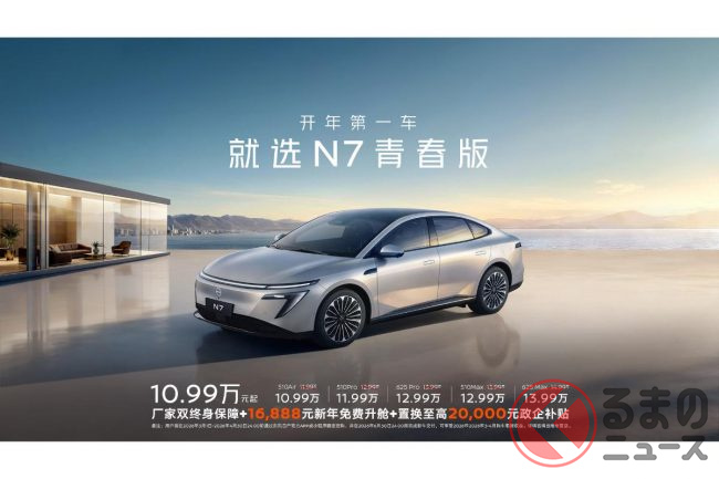 日産と中国東風汽車の合弁会社「東風日産」は2026年2月24日、現地で生産するフル電動4ドアセダン「N7」の価格を1万元(約23万円)引き下げた「N7ユースエディション」を発売しました。