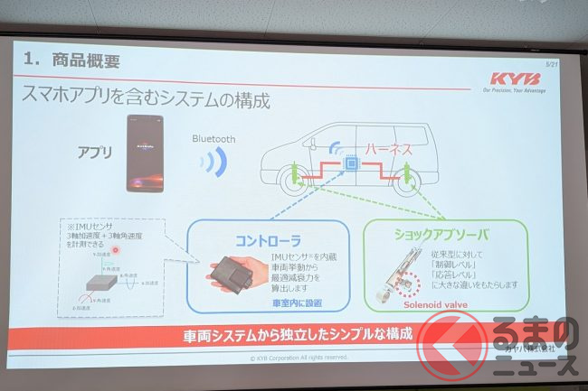 物理的には、ソレノイドバルブを備えた前後のショックアブソーバーと、制御の要となるIMU(3軸加速度&3軸角速度、つまり6軸センサ)を内蔵した車載コントローラー、さらにこれらを繋ぐハーネスの3要素です。