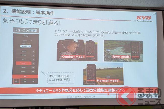 操作はまさに今ドキで、スマホ上でおもにスライダーを動かすタイプ。スマホのアプリ内では基本プリセットとして「コンフォート」「スポーツ」「ノーマル」が用意され、さらに個別チューンできるカスタマイズ×3モードという、計6つが選べます。
