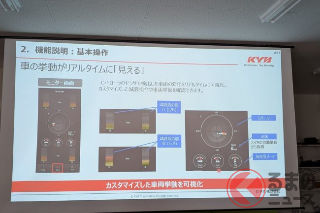 また画面上でIMUが検知した車両の挙動は可視化され、減衰の指令がどのように下されているか、リアルタイムで確認可能。いわば乗り味を変えると同時に、車両の状態が手元で見えるところが、“新たな楽しみ”というわけです。