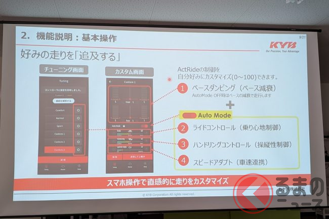 足まわりという専門的なセッティング領域が、スマホ上で見える化されて、乗り手が気軽に調節できるようになったことが素晴らしいポイント。