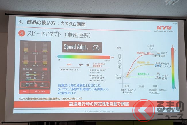 さらに低速では乗り心地、高速では接地感や安定性を重視し、速度に応じて減衰力を効果的に決める「スピードアダプト」があります。