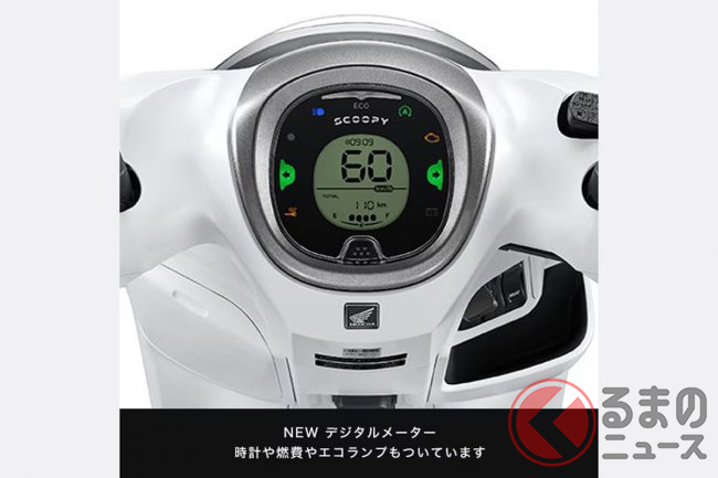 利便性の面では、フロントのインナーボックスにUSB Type-Cソケットを装備。ヘッドライトには明るく見やすいモダンなリング状のLEDを採用し、メーターはエコランプ付きの新型デジタルメーターとなっています。