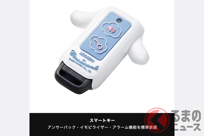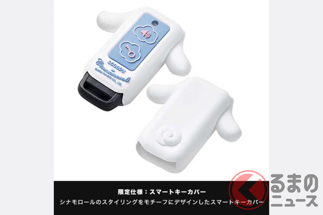 シナモロールのスタイリングをモチーフにデザインされたスマートキーカバーや、専用デザインのフロアボード、リムステッカーが装着され、限定生産であることを示すシリアル番号ステッカーも貼付されます。