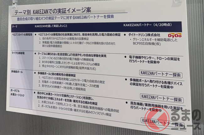 豊田合成担当者は「実証実験はまだこれからでして、僕らが提案するアイテムとしてこういうものがあるのではないか。街の中心となるエネルギーというところに対してアプローチをしていこうという考え方です」と語ります。