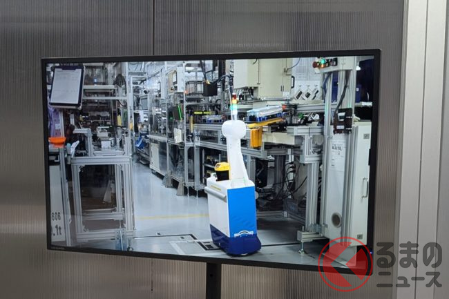 豊田自動織機担当者は「工場や街中など人がたくさん通る場所で、センサーを使わずにモーターの力だけで外力を検知して動いてくれます。軽く押すだけで押し負けて後退し、定位置まで戻ってくる機能を持っています」と解説します。この制御により、狭い通路で人と接近した場合でも安全な運用が可能です。
