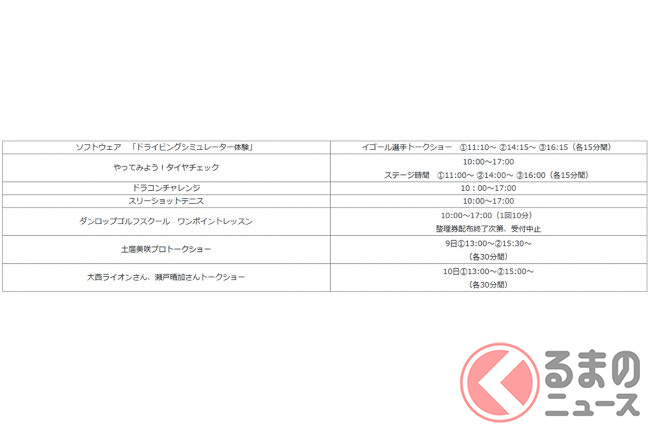 また、会場内のステージでは、レーシングドライバーのイゴール・オオムラ・フラガ選手や、元プロテニス選手の土居美咲氏らが登場し、トークショーなどが実施される予定です。