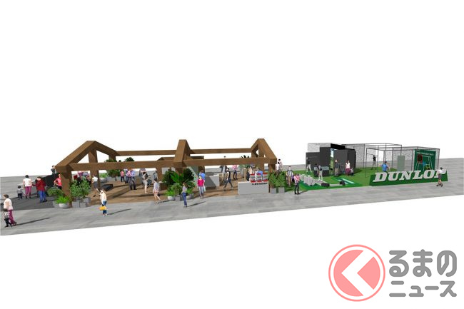 ガレージゾーンでは四輪・二輪車の展示に加え、ドライビングシミュレーターによるレースゲーム体験などを用意。また、DUNLOPと広告出演契約を締結している大谷翔平選手の等身大パネルも展示される予定です。
