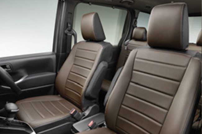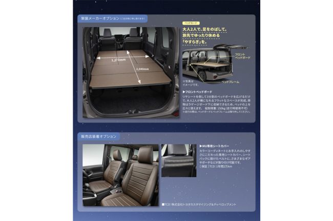 専用のLEDルームランプや小物置き、1500Wのアクセサリーコンセントも完備されており、車中泊を快適にサポート。汚れに強い専用シートカバーも備わっています。