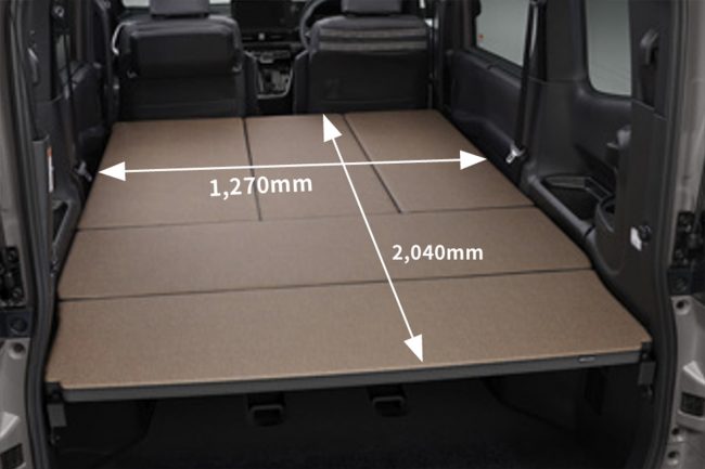 一方、旅先での休息に最適なのが「ベッドモード」です。リアシートを倒し、オプションのフロントベッドボードを組み合わせることで、大人2人がゆったりと足を伸ばして寝られるフルフラットな空間に早変わりします。