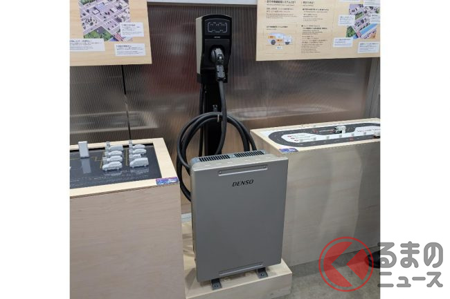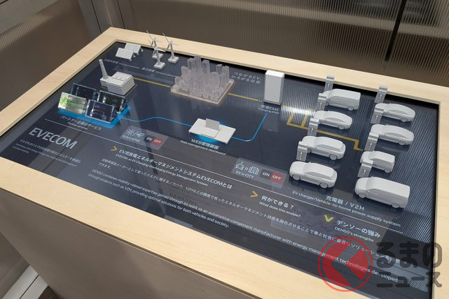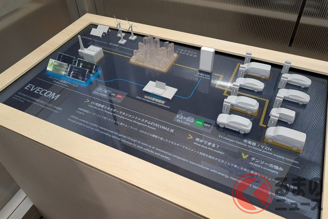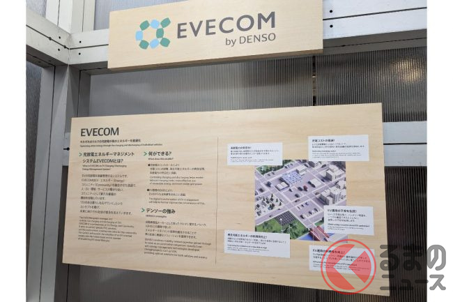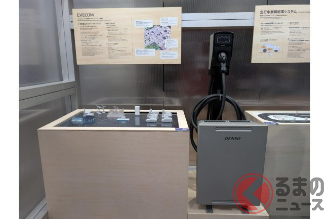 デンソーブースでは、EV(電気自動車)の充放電エネルギーマネジメントシステム「EVECOM(イブコム)」と「走行中無線給電システム」が紹介されました。