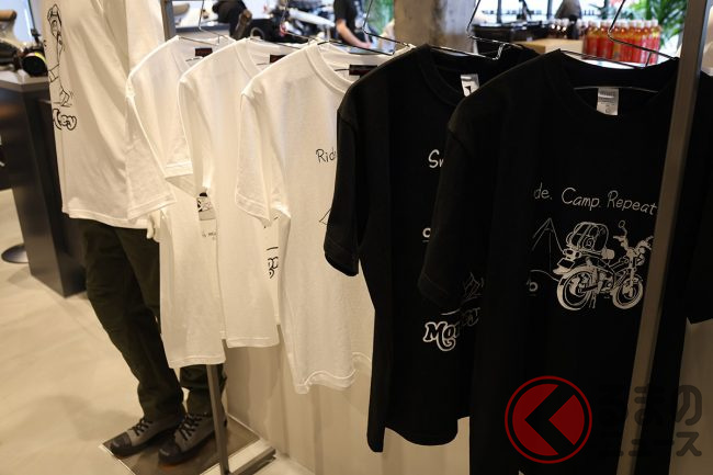 店内にはここでしか手に入らないオリジナルのカスタマイズパーツと、それらを実際に装着した3台の展示車が並んでいます。アパレルについても、人気イラストレーターのデザインを採用したオリジナル T シャツや、ロゴ入りタンブラーなど、普段使いできるアイテムをそろえています。