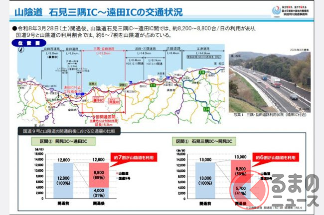実際に、国土交通省中国地方整備局 浜田河川国道事務所が、開通から約3週間後の4月17日に発表した交通状況データ(速報値)によると、山陰道の利用交通量は石見三隅IC~岡見IC間が約8200台/日、岡見IC~遠田IC間が約8800台/日(共に4月1日時点のデータ)となっており、山陰道と並行する国道9号の利用割合では、約6~7割が山陰道を利用しているという結果になり、早速、山陰道経由とするクルマが増えています。
