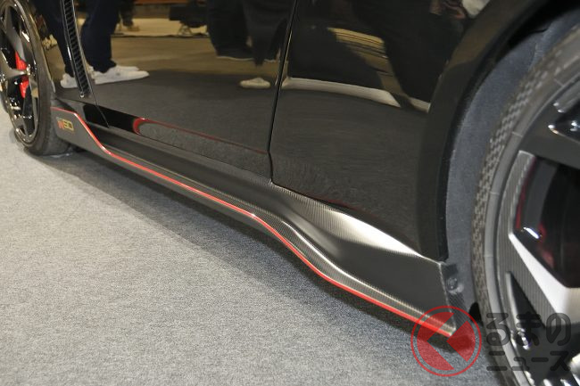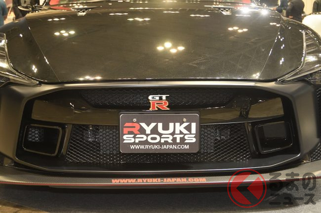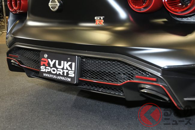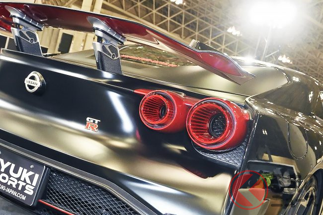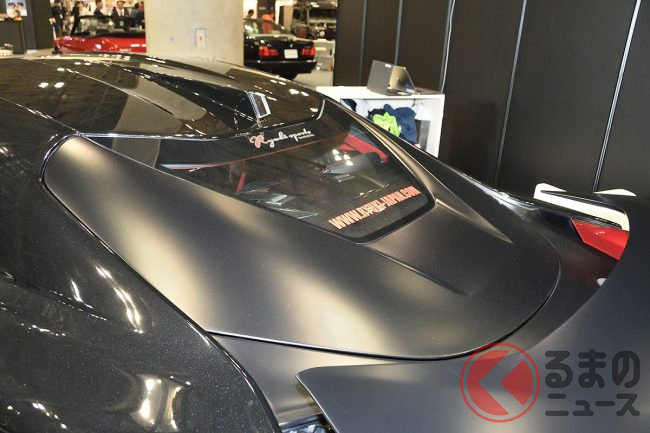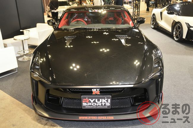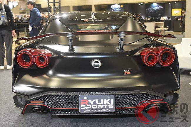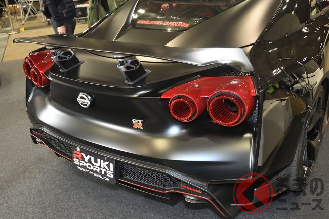 イタルデザインブースに展示されたGT-R50 by イタルデザインは、GT-R専門店の「RYUKI SPORT」の車両で、黒いボディに赤い差し色が入ったエクステリアが精悍なイメージを一層強めています。