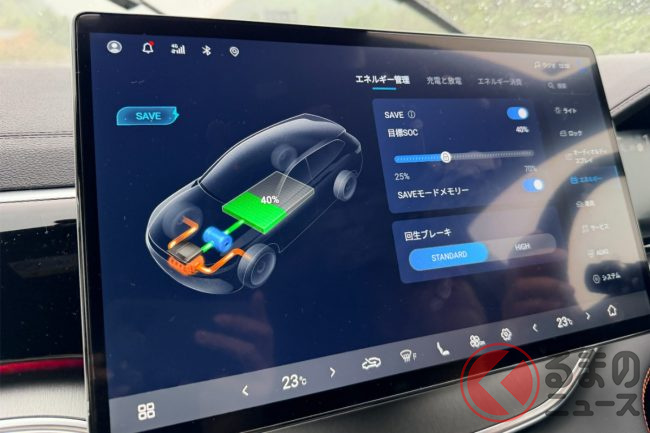 エネルギー管理は綿密になり、インストルメントパネル中央にある15.6インチの大型モニターにその分担が表示されます。勾配の変化に合わせて、上りではエンジンをモーターがアシストし下りでは発電。