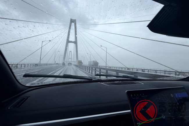 また、カタログに記載はありませんが車線の中央を維持するレーンキープアシストを装備しています。その制御にクセがあり、車線の左寄りを走りたがることや路面の横断勾配に弱く進路がカーブの内側にズレることも。車線の内側の四角いドットが並んでいる場面では特にそうなので、日本の道路事情に合わせた熟成が必要でしょう。