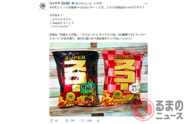 2019年5月に湖池屋から、リッチなフレーバーを特徴とする「SUPERスコーン」が発売されますが、このSUPERスコーンを紹介すべく、コイケヤ公式ツイッターで商品紹介の投稿した際に、SUPERスコーンを「Supra(スープラ)スコーン」と間違えてツイートしてしまったのです。