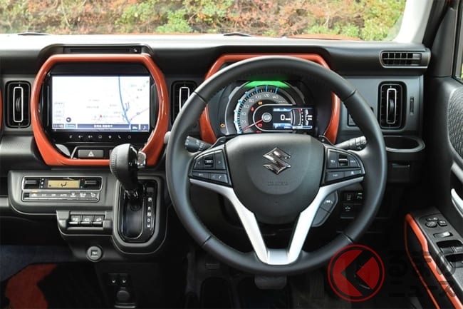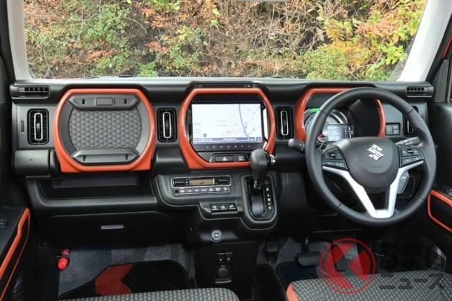 内装ではスズキ初の9インチモニター採用したインフォテイメントシステムや、インパネを3つのベゼルを用いて機能を独立させたデザインとすることで、外観と同様にアウトドアテイストを取り入れています。