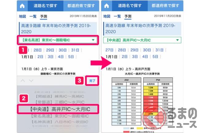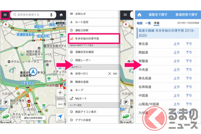 ヤフーは、無料カーナビアプリ「Yahoo!カーナビ」上で「年末年始の渋滞予測 2019-2020」を公開しました。全国9路線が対象となっています。