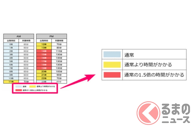 対象路線(区間)の通過に必要な所要時間の確認や、通常期(GWやお盆、年末年始などの交通混雑期を除いた期間)と比較した混雑具合も確認できます。