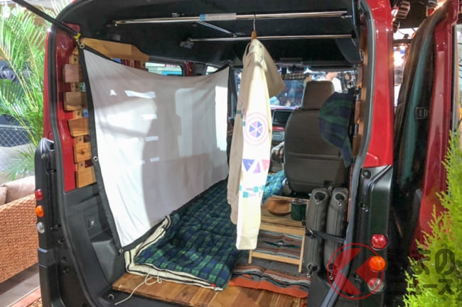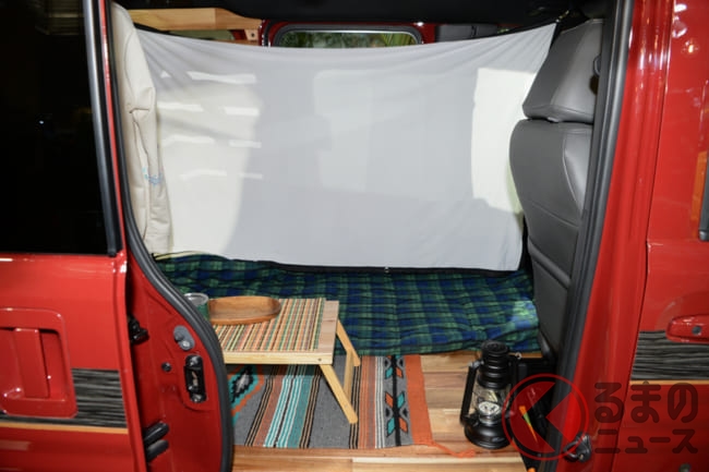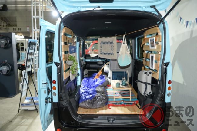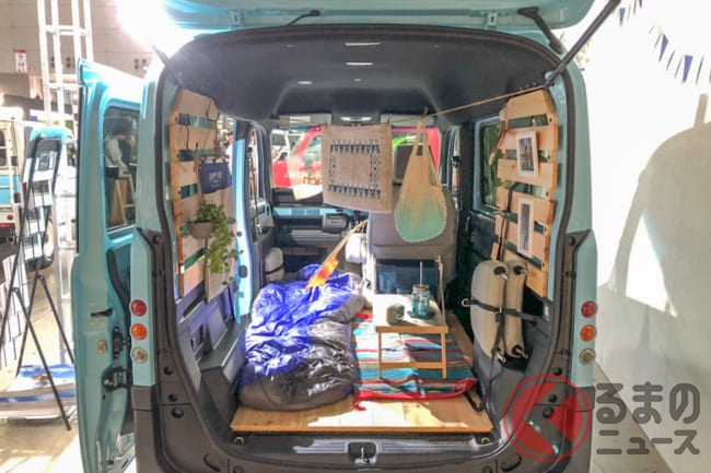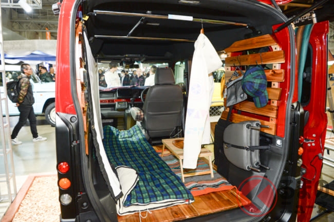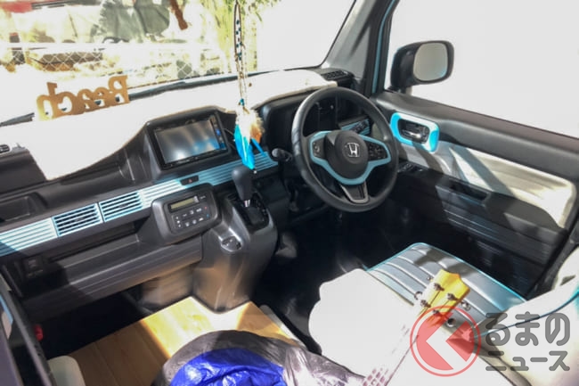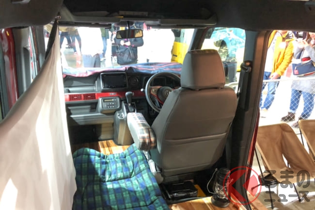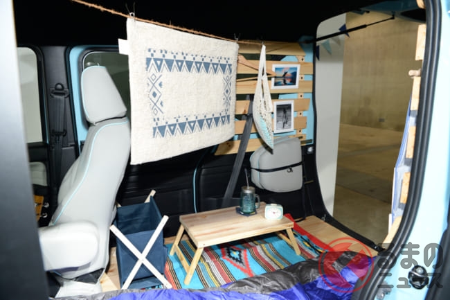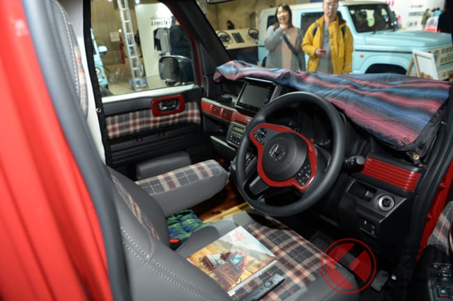 「アウトドアで楽しく使えるクルマとして、ボディキットを開発しました。後部座席だけてなく、助手席までフルフラットになるN-VANの特徴を活かし、フローリング材を敷くとリビングルームのようにくつろげる空間が広がるような仕様となります」