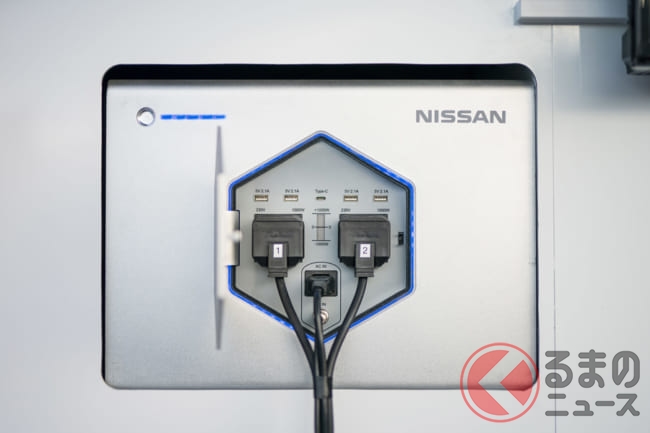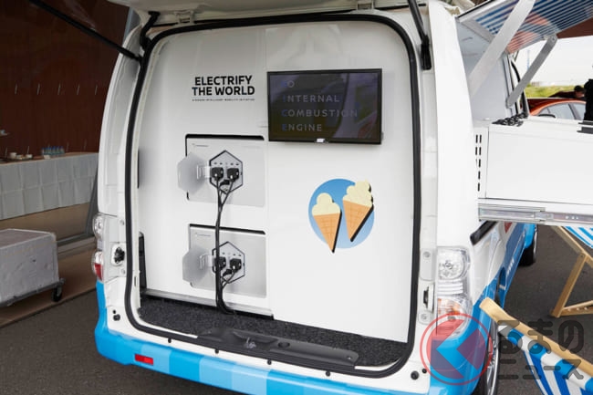 走行用モーターは40kWhのバッテリーで駆動しますが、アイスクリーム移動販売車に搭載される設備は、日産の第一世代の電気自動車(初代「リーフ」)から回収されたリチウムイオンバッテリーを再利用した、ポータブル蓄電バッテリーから給電しています。