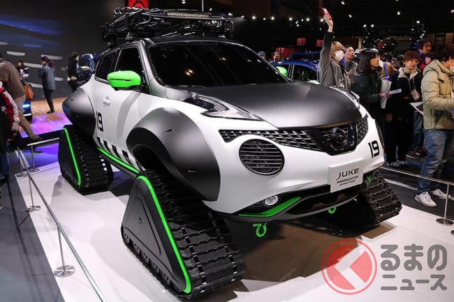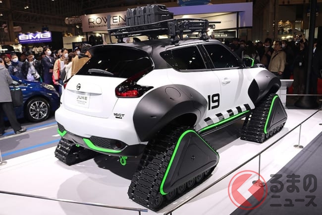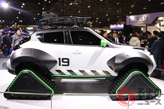 なお、展示車両に装着されていたクローラーは海外で市販されているものなので、国内でも構造変更手続きさえおこなえば、公道を走行することも可能なようです。