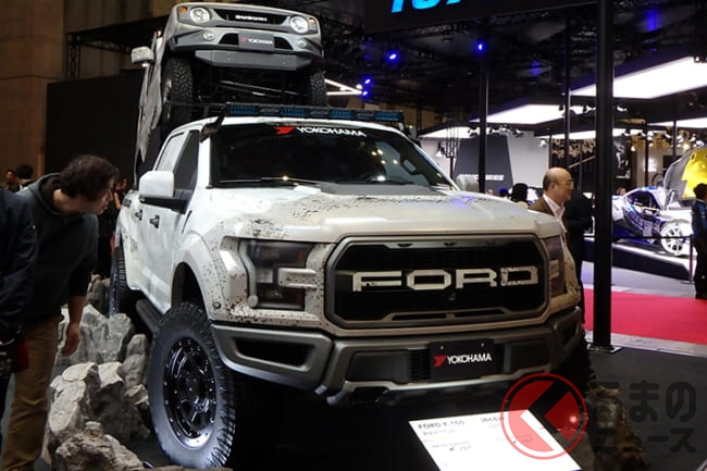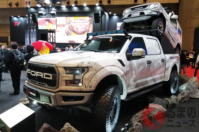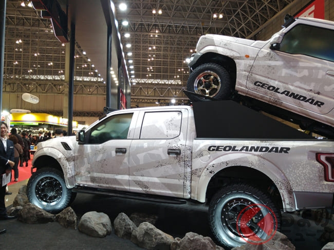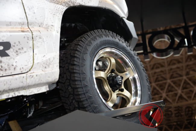 SUV/ピックアップトラック用タイヤは、オフロード感を高めたオールテレーンタイヤ「GEOLANDAR X-AT」、マッドテレーンタイヤ「GEOLANDAR M/T G003」、趣味性を高めたマッドテレーンタイヤ「GEOLANDAR X-MT」。デモカーは、ラプターとジムニーです。