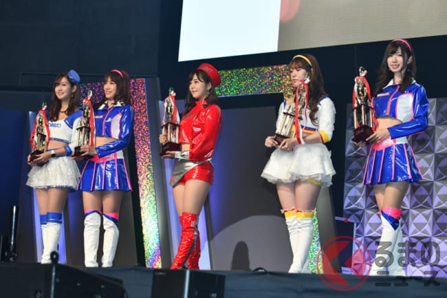 そして、イベントの終盤にはいよいよ大賞が発表されます。大賞に選ばれるのはさまざまなレースで活躍したレースクイーンの個人5名で、さらにこのなかから2019年の大賞グランプリが選ばれるというわけです。