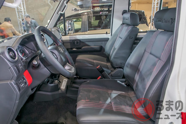 内装においては、気になるのが、シートトリムです。再販モデルの76系や79系のように、素っ気ないトリムではなく、中央部分に迷彩柄をあしらった2トーンになっています。ヘッドレストにはランドクルーザー70のロゴが欧文で刺繍されており、1980年代の70系を彷彿とさせます。