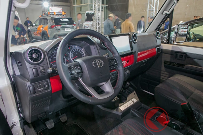 丸目のなかには、縁を彩るリング形のLEDデイライトと、LEDヘッドライトバルブが見えます。さらにフロントグリルには、アースマークではなく、昔ながらのTOYOTAレターマークのバッジが取り付けられています。そこには往年の70系の顔があり、ファンはこれだけでも感涙ものです。
