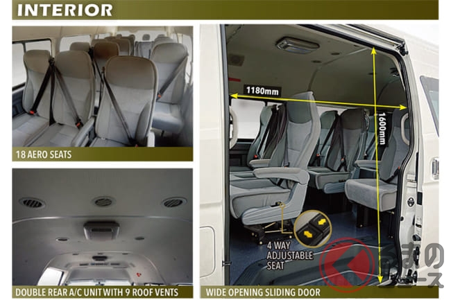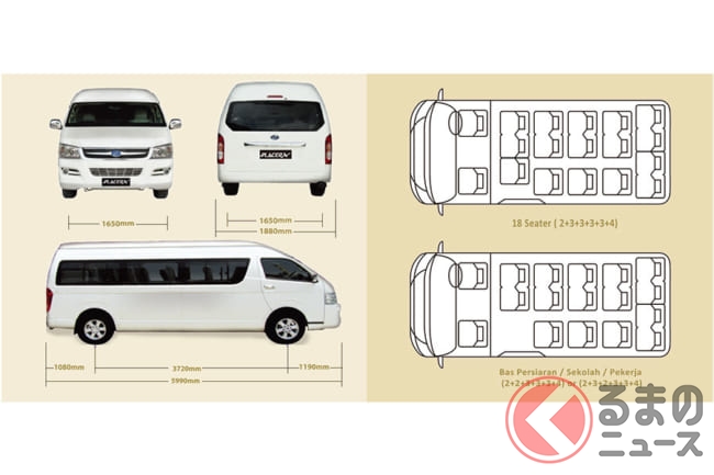 全長5990mm×全幅1880mm×全高2285mmでホイールベースは3720mm。日本では小型のマイクロバスほどのサイズとなり、シートは10席から18席の間で設置可能となっています。