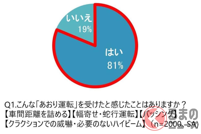 同調査では、「あおり運転の被害を受けたことがあるか」という質問に、約8割が「あおり運転を受けたと感じたことがある」と回答。